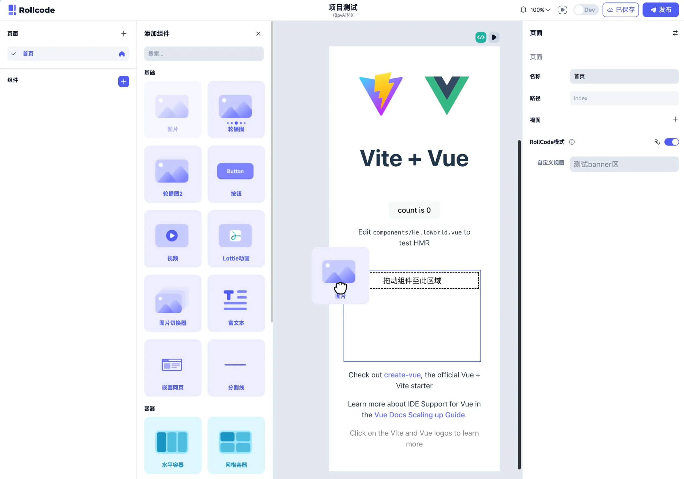 操作界面如下图所示。通过这一手段,可将已有业务代码快速接入 RollCode 平台,无需重新开发,即可实现页面编辑、数据绑定、组件配置等功能。